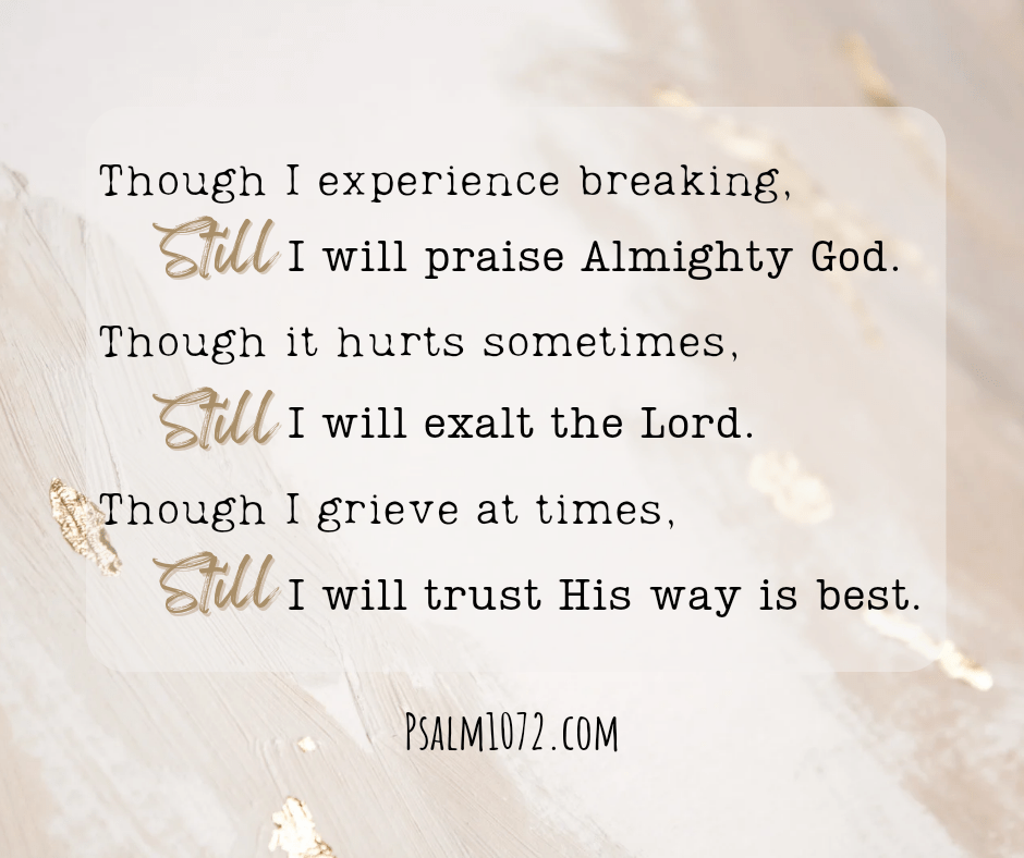 Though I continue to experience the breaking, still I will praise Almighty God. Though it hurts sometimes, still I will exalt the name of the Lord our God. Though I grieve at times, still I will trust His way is best and yield to the Holy Spirit.